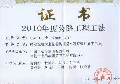 近日,公司主编的《振动沉模大直径现浇混凝土薄壁管桩施工工法》喜获中国公路建设行业协会2010年度公路工程工法,并录入国家公路工程工法汇编。