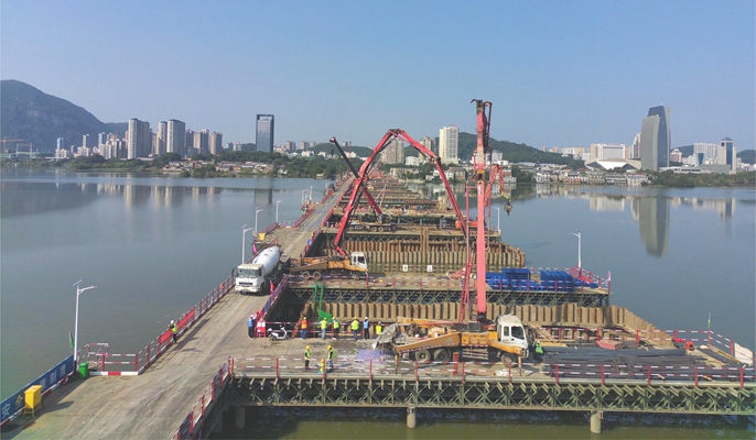磁湖绿色廊道工程位于黄石市中心城区,全长约1.5公里,规划在磁湖南侧修建一条跨湖大桥,将沿湖路-磁湖大桥-苏州路全线打通,实现团城山和磁湖南片区的直接快速联系,有效引导磁湖南片区的土地开发和产业发展。磁湖大桥全长846米,断面宽度30.6米,双向4车道,设计为17孔连续钢筋混凝土葵花拱桥,桩基共计294根,共有18座承台。
