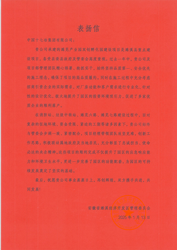 近日,濉溪县经济开发区管委会向中国十七冶集团致表扬信,对濉芜产业园双创孵化园项目部在过去一年里心部署、抢抓实干,确保项目高品质履约表示感谢。