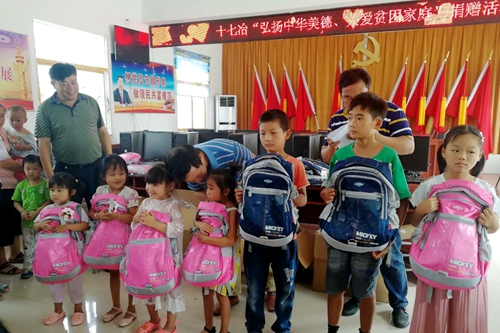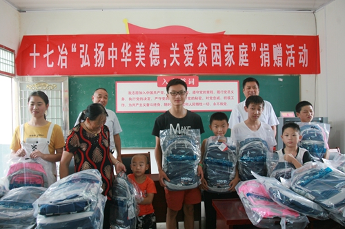 83192日,在新学期来临之际,中国十七冶集团在和县功桥镇长建村、定远县蒋集镇秦集村两个定点扶贫村开展以“弘扬中华美德,关爱贫困家庭”为主题的捐赠活动。共捐出百套书包、文具和12台电脑,使百名贫困学子新学期背上了新书包。