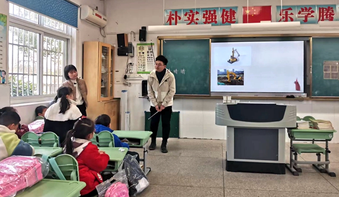 随后,南京农业大学项目青年突击队的团员青年结合建筑行业知识为孩子们讲授了一节趣味课。大家精心制作课件,以卡通形象为切入点向学生们介绍挖掘机、打桩机、卡车等工程车辆在项目建设中的用途,生动形象的讲课点燃了孩子们浓厚的学习热情,启发了他们对建筑行业的兴趣,拓宽了他们的知识面,青年突击队的成员们也在和学生互动过程中体验到奉献自我的快乐,进一步增强社会责任感。