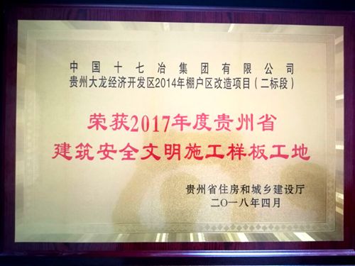 5月23日,由中国十七冶集团江西分公司承建的贵州大龙2014年棚户区改造项目(二标段)获“贵州省2017年度建筑安全文明施工样板工地”荣誉称号。